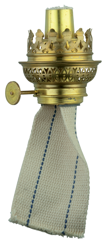 Parafinlampebrenner 14»’ med veke. Dette er den største rundbrenneren. Lysstyrken tilsvarer en glødepære på ca 7-8 watt. Varmeeffekt ca 200 W som betyr et forbruk på 0,2 dl/t.